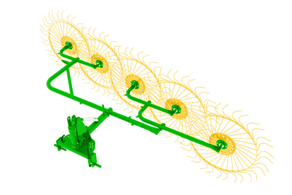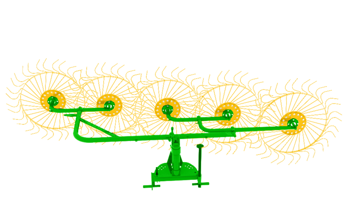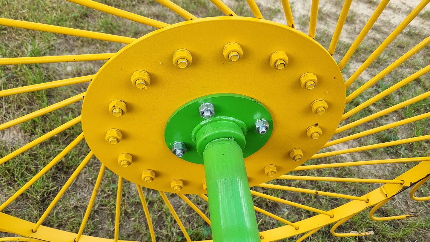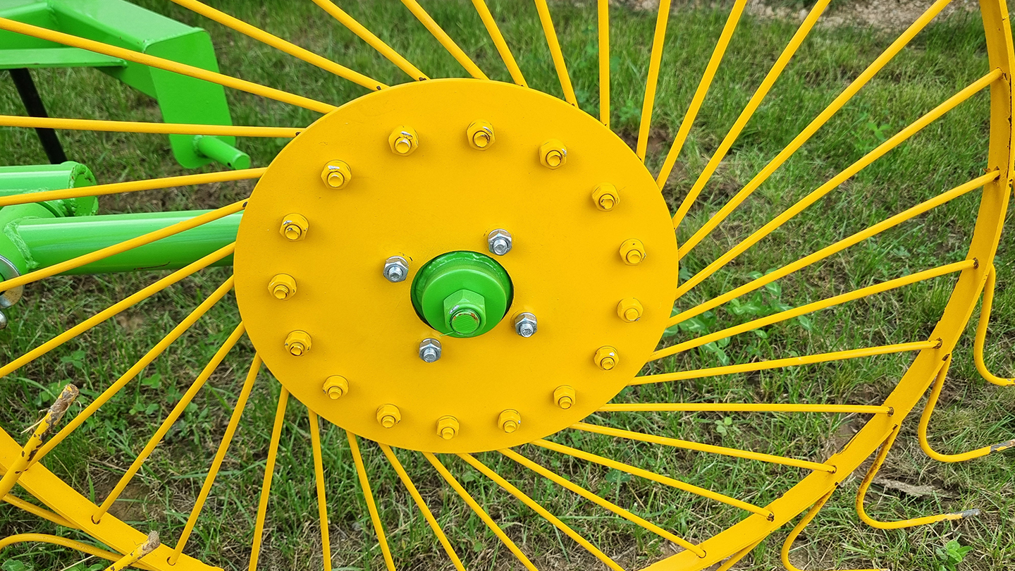 Рабочие колеса граблей имеют диаметр 1,2 метра и оснащены спицами заводского производства, изготовленными из высокопрочной пружинной стали толщиной 6 мм и окрашены порошковой краской. Диск крепления спиц усилен и имеет толщину 5 мм. Колеса установлены на двух 205 подшипниках, гарантируя надежную и длительную эксплуатацию.
