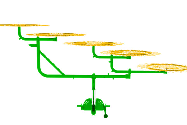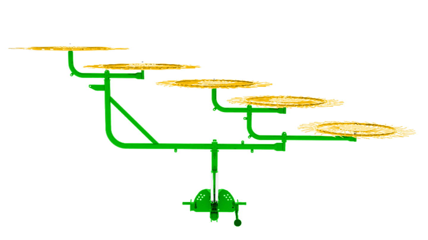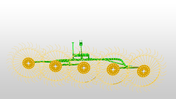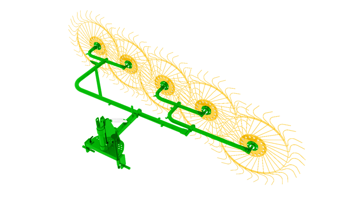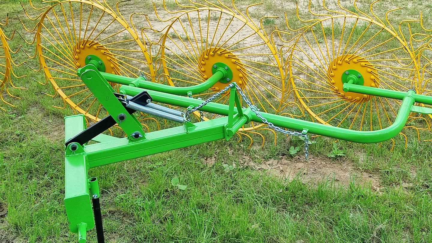 Рабочие колеса граблей имеют диаметр 1,2 метра и оснащены спицами заводского производства, изготовленными из высокопрочной пружинной стали толщиной 6 мм и окрашены порошковой краской. Диск крепления спиц усилен и имеет толщину 5 мм. Колеса установлены на двух 205 подшипниках, гарантируя надежную и длительную эксплуатацию.